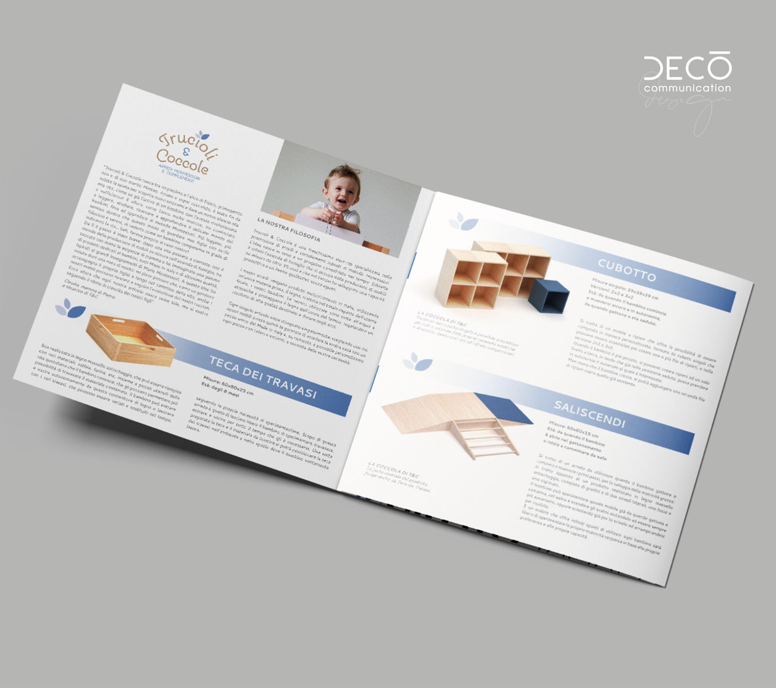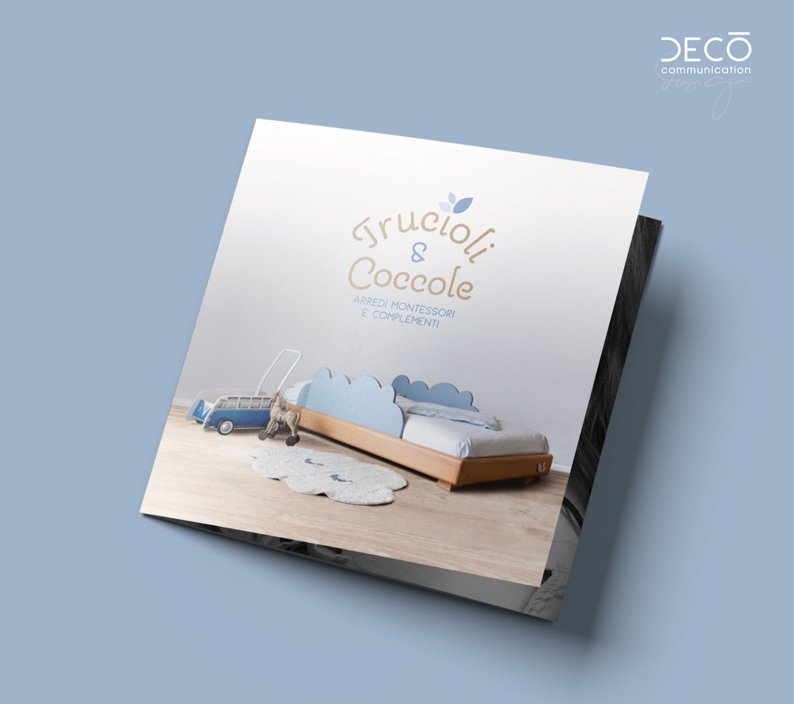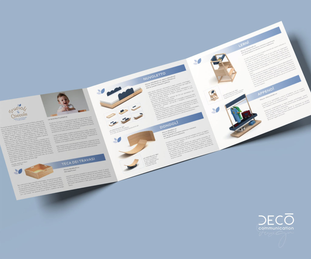 Per loro abbiamo creato il brand partendo dalla ricerca del nome che doveva trasferire il concetto di artigianalità, qualità e di utilizzo del legno, materia prima con cui sono fatti i mobili. Non meno importante il concetto della coccola dedicata al bambino. Il simbolo iconografico delle tre foglioline diventa molto riconoscibile su tutti gli arredi e simbolo identificativo dell’azienda.